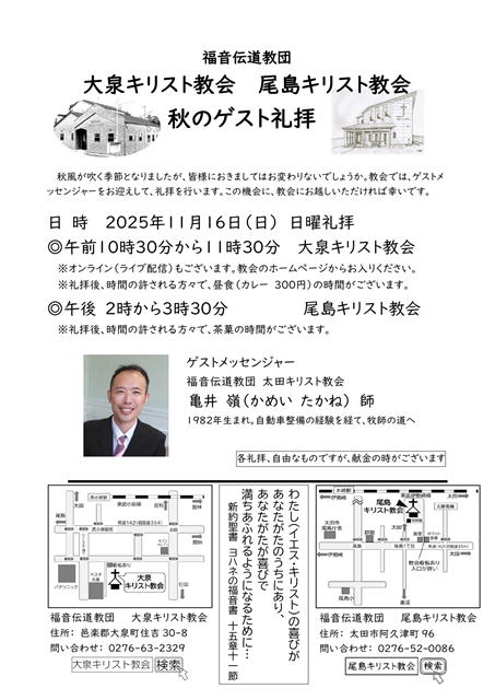 福音伝道教団 大泉キリスト教会のホームページへようこそ。私たちの教会は、1949年から大泉町で伝道を開始した教会です。小さい教会ですが、神様を見上げつつ、温かな交わりのある教会です。ぜひいらしてください。歓迎いたします。